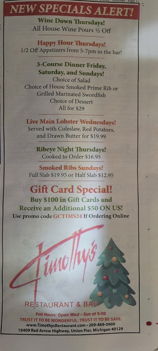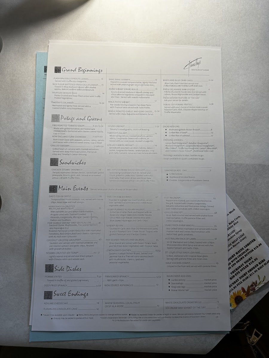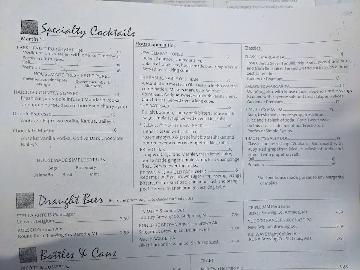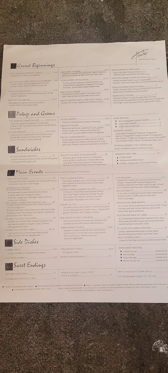 Timothy's Restaurant Menu